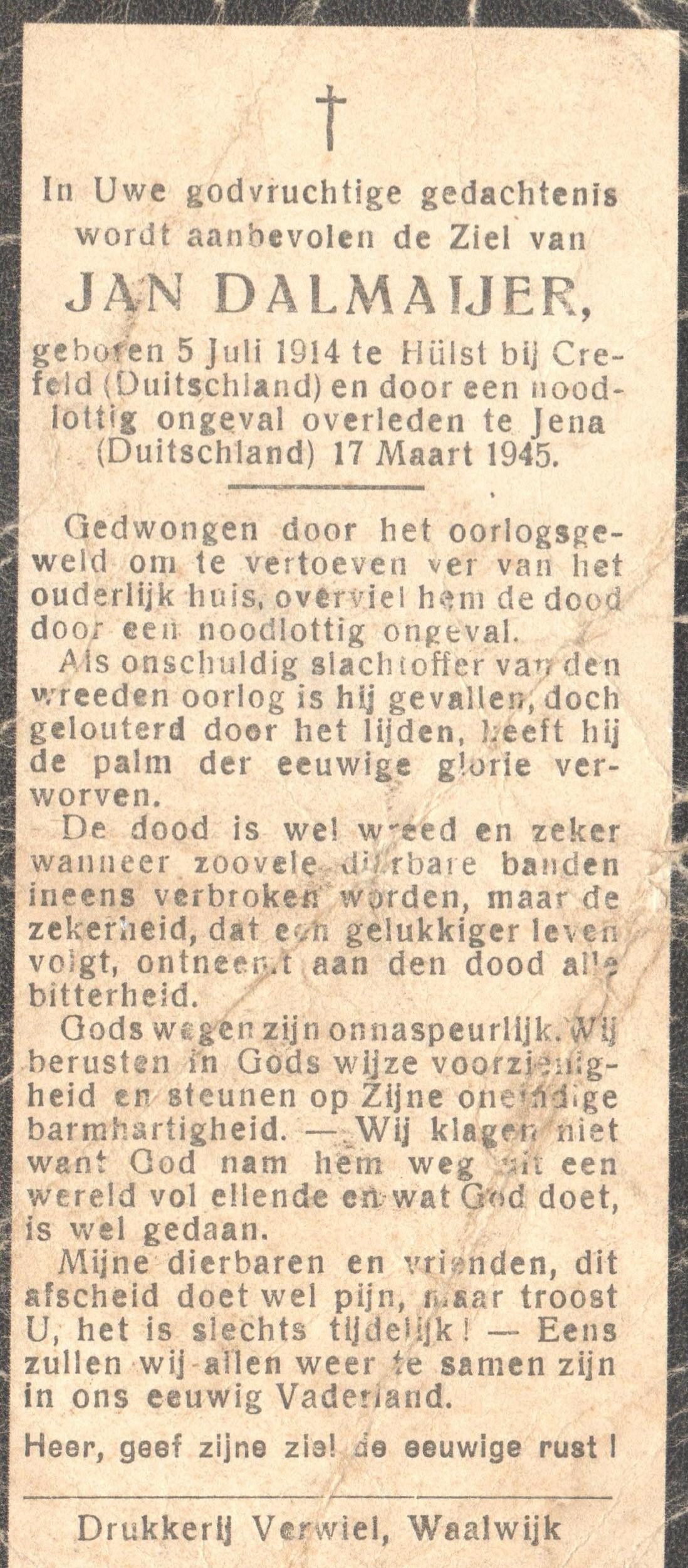 Bidprentje Johan (Jan) Dalmaijer (collectie Jan Dalmaijer, Waalwijk)