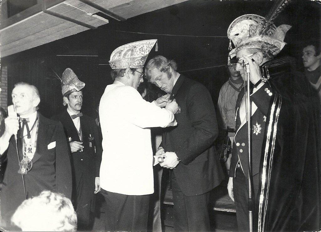 Uitreiking van de Vergulde Kaai aan Wim Ruska, 26 januari 1973, met uiterst links ceremoniemeester Peer van den Muggenheuvel alias Piet Brouwer en kanselier Jan de Haan (collectie Jan de Haan)