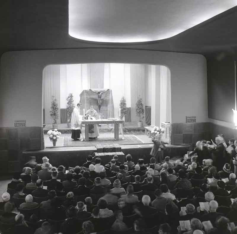 Opdragen van de H. Mis in het theater en bioscoop Musis Sacrum aan de Grotestraat 279, oktober 1967 (foto J. de Bont, Waalwijk/collectie GAW, fotonr. 88566)