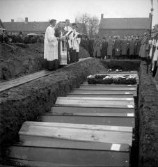Begrafenis van 16 van de 17 slachtoffers, omgekomen door een V-1-inslag in de Grotestraat op 10-02-1945, in een massagraf op het kerkhof van de R.K. parochie St.-Johannes de Doper door militairen en Rode Kruis. De pastoor staat bij de kisten (foto: J. de Bont, Waalwijk/GAW, nr. 82940).