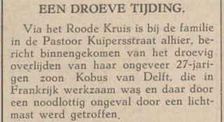 Overlijdensbericht Kobus van Delft uit De Echo van het Zuiden, 10 september 1941.