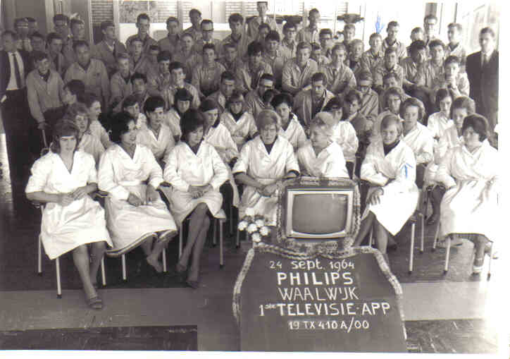 De personeelsleden van de Waalwijkse Philipsvestiging presenteren het eerste door hen vervaardigde televisietoestel (collectie Wim van den Hoek)