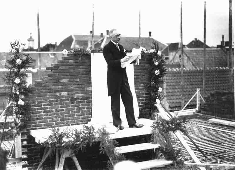 Burgemeester Moonen leest de oorkonde voor die hij enige ogenblikken later met een gedenksteen zal inmetselen in de hal van het nieuwe raadhuis, 25 augustus 1931 (GAW, fotonr. 50023, foto Fotopersbureau Het Zuiden)
