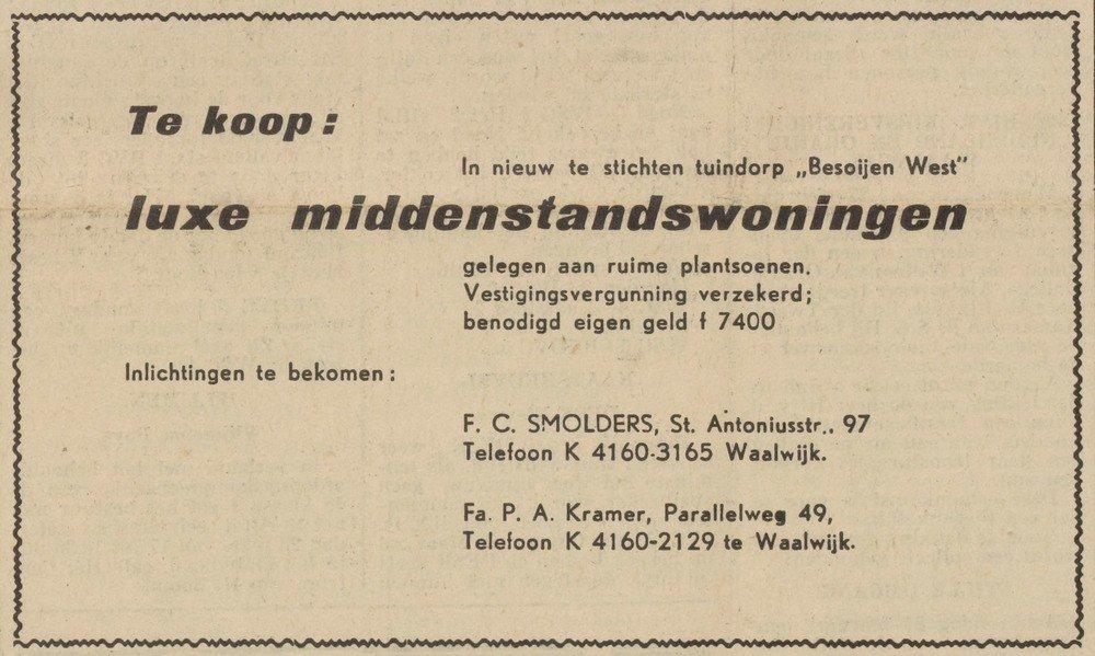 Te koop: luxe middenstandswoningen in Tuindorp Besoijen (Echo van het Zuiden 22-02-1956)