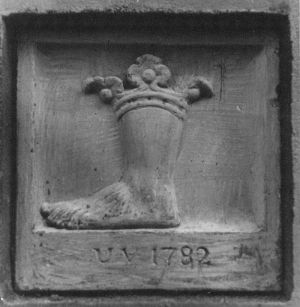 Ter herinnering aan dit gebeuren is in de westgevel van het pand een gevelsteentje aangebracht. Het steentje is van wit marmer, groot ongeveer 12 x 12 cm. Het draagt als afbeelding een gekroonde voet met daaronder U V 1782. Het gevelsteentje is jarenlang bedekt geweest met een pleisterlaag, maar in 1929 weer ontdekt en zichtbaar gemaakt. Het is te zien vanaf de Grotestraat over de poort kijkende.