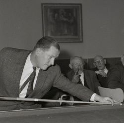 Tijdens de huldiging in het gemeentehuis na het behalen van zijn Europese biljarttitel wordt Kees de Ruijter toegesproken door burgemeester Lambooy, februari 1950 (Collectie SALHA, fotonr.11674, foto Fotopersbureau Het Zuiden).