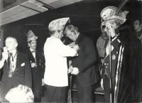 Uitreiking van de Vergulde Kaai aan Wim Ruska, 26 januari 1973, met uiterst links ceremoniemeester Peer van den Muggenheuvel alias Piet Brouwer en kanselier Jan de Haan (collectie Jan de Haan).