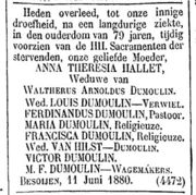 | 3 jun 2024 09:46 | Overlijdensannonce Anna Theresia Dumoulin-Hallet.jpg (bestand) | 37 kB | Jan | Overlijdensannonce Anna Theresia Dumoulin-Hallet (uit: De Tijd, 16 juni 1880) | 1 | |